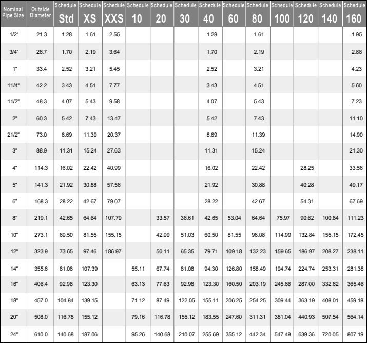 Dưới đây là bảng kích thước / độ dày của ống thép đúc Sch40